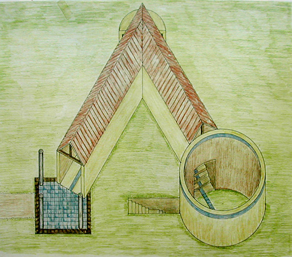 Upon entering under the roof of the Baptistery, the sequence would be one of darkness to light, chapel (place of the end) to garden (place of beginning). In the initial leg of the Baptistery, the group’s path is obstructed by a column/tree trunk: this image was drawn from Dante’s Inferno, the fearful “dark wood”, an obstacle on the path to light and salvation. The corner of the Baptistery is an altar niche, formed by a half-barrel, containing a crucifix: the niche is lit by light slits on each side.