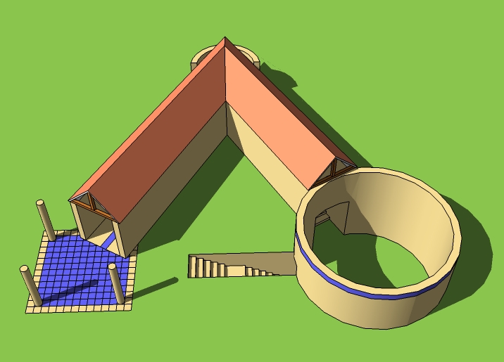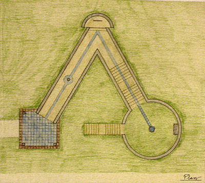 Emilio Ambasz's statement that “the garden is the myth of beginning, the chapel that of the end” sparked the scheme. I had of course been looking at Rossi’s work, so the notion of stripped down geometric shapes (square, circle, triangle) were in my mind: but the stew of memories and images from my “old country” was also readily evoked. The terra cotta tiles and old wood beams of barns, the weathered ochre stucco, the elements of nature growing on and overtaking structures that were hundreds of years old: all these were easy to recall.