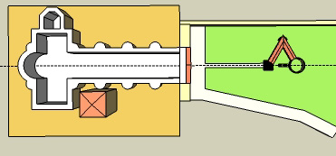 The scheme largely leaves functionality behind. Indeed, the project is mostly about symbols. The sequence of the Baptism would be as follows: the priest, the godparents, and the parents carrying the baby would walk out of the Basilica and walk to the square entry pad of the Baptistery, there faced with three columns (that symbolism is fairly obvious). The blue central field (the blue of course standing for water) of the square would lead the group into the Baptistery proper through a narrow stripe of blue.