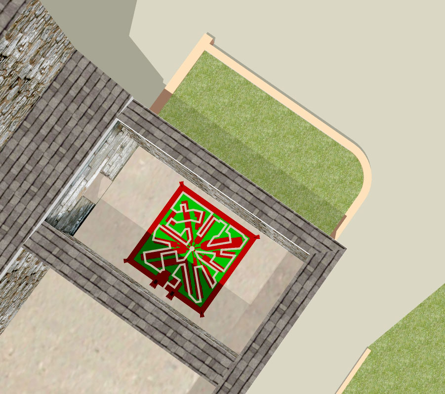 I also imagined the labyrinth as a landscape installation at a size which could be walked through. The ideal location would be the triangular lawn area labeled “Baseball Diamond” on the tour map. The plan elements would be made of boxwood grown to a couple of feet high, and the path would be made of gravel. However, the boxwood would need two years to grow, the labyrinth would then require continued maintenance, and the budget would likely be over the amount allotted by the proposal, so this scheme may have to remain an enticing dream.