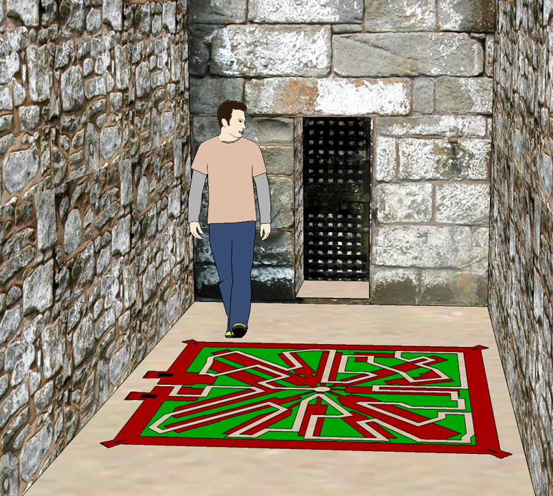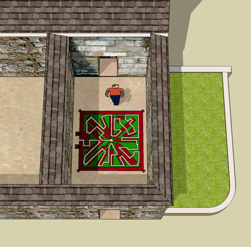 Placing the design in the one area where the prisoners were allowed to walk freely seems to me fitting, since a labyrinth, even in small designs, represents something meant to be walked through. As the exercise yard is too small for a design which can actually be walked, this labyrinth is more symbolic, just as the Roman ones were, and is an object of meditation and reflection on the idea of confinement and paths to freedom, and will be “walked” only by the mind. The labyrinth plan is placed within the exercise yard with its entrance facing south, to reflect Eastern State’s actual compass orientation.