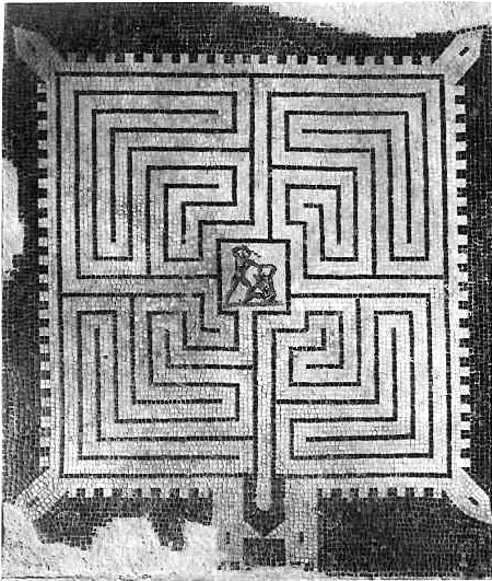 The symbolism and actual design of labyrinths has historically been associated with the image of walled fortresses and prisons. The best known example of a labyrinth, the one at Crete which held the minotaur, was likened to a prison of no return (which it was not for Theseus, thanks to Ariadne.) Ancient Roman mosaic representations of labyrinths were usually depicted as fortified cities with walls, battlements, corner towers, and entrance gates (fig. 2), which is also an accurate description of Eastern State Penitentiary.