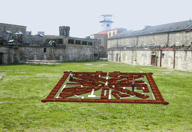 This is a proposal for a painted labyrinth image for the Art Installation program at Eastern State Penitentiary in the Fairmount section of Philadelphia. The labyrinth is located in the last remaining solitary exercise yard, and is an abstraction of the plan of the prison. The image is app. 7ft. x 7ft and will be painted on the concrete floor of the yard with interior latex house paint so as to naturally weather and eventually fade away.