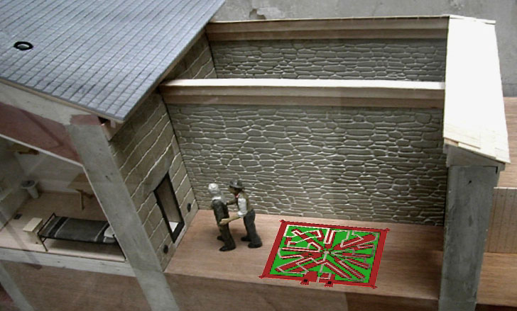 Model of Eastern State Penitentiary cells and exercise yard (in display at the facility) with superimposed labyrinth design.